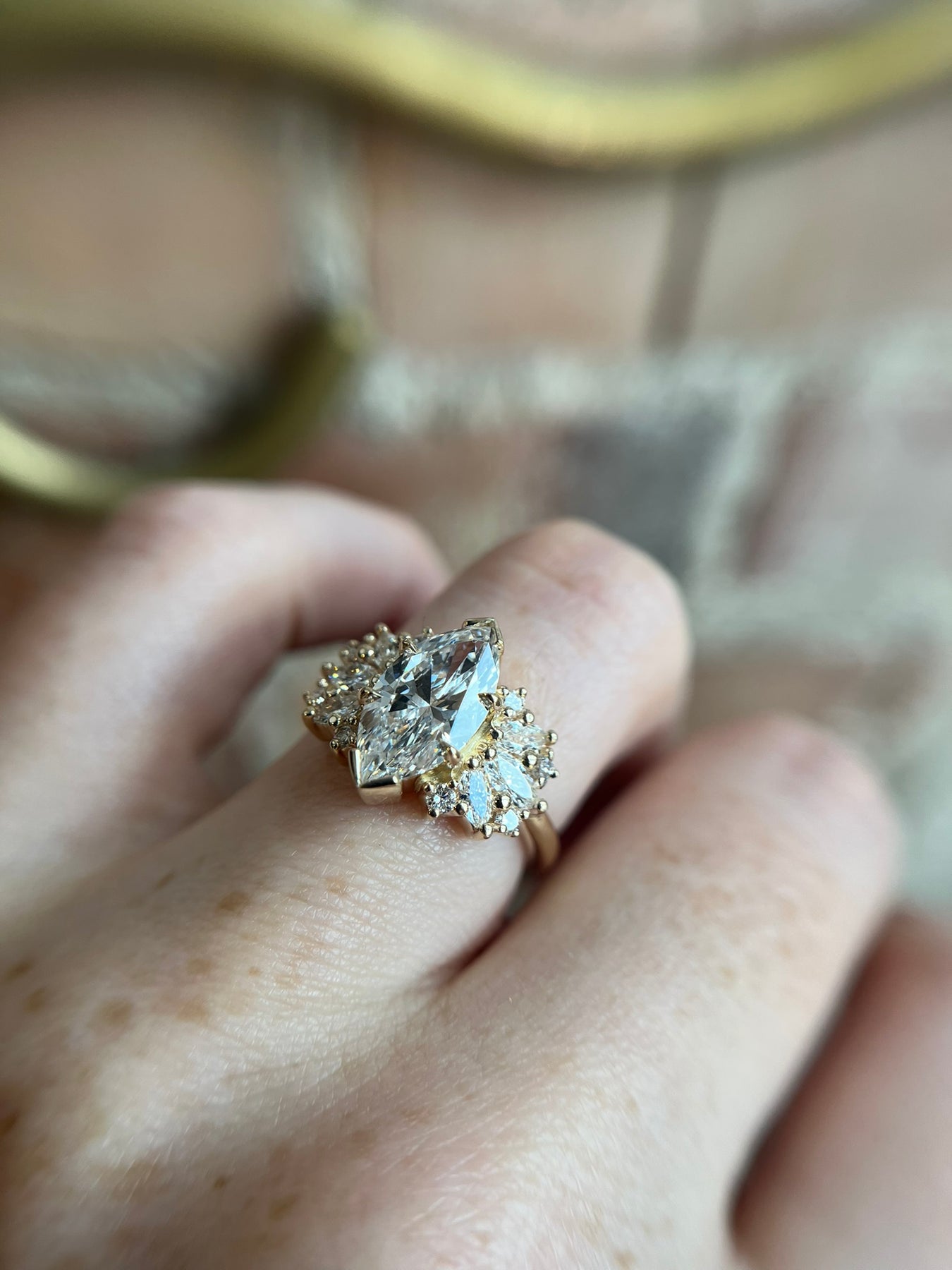 Set in certified recycled 14K yellow gold, Clara radiates warmth while making a statement about conscious luxury. Every element is designed to honour the marquise's natural drama.